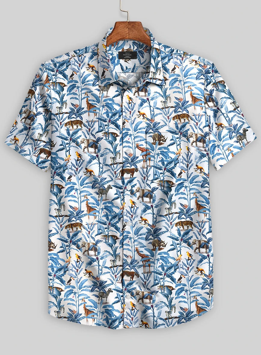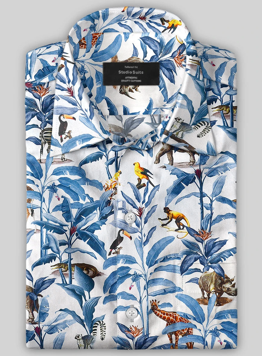 Portray the natural aesthetics with our Italian Cotton Rain Forest Shirt, crafted from pure cotton, which draws a delicate, stylish, versatile look with forest and animal patterns. At the same time, the blue tint elevates the visual appeal of turning up the tropical excursions and warm settings.
