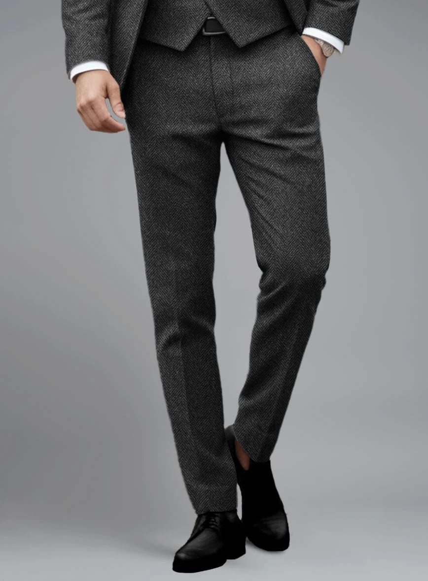 Inject a voguish touch into your collection with our Italian Highlander Charcoal Herringbone Tweed Pants. Crafted from the finest wool, this garment radiates opulence in a deep charcoal hue, accentuated by a sophisticated herringbone weave. The sumptuous woolen fabric not only provides warmth but also adds a daring flair, making it ideal for autumn soirées or winter occasions. Whether you’re making a statement at a gala or