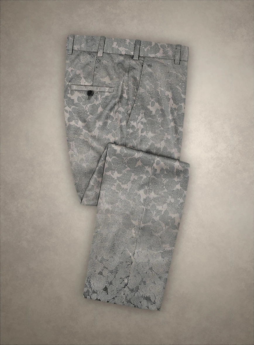 Admire subtlety with modest sophistication by pairing our Italian Silk Unaxi Pants. Firstly, constructed from a flourishing blend of silk, cotton, lycra and jacquard fabric that grants a thick, bristly nature and a hint of shine to the material with a stamped leafy pattern over gray hues. And finally, bring your suave game to the next level by uniting delicately tailored gray pants that add a layer of charm while capturing the honed silhouette with a cozy fit that perfectly harmonizes comfort and sharpness regardless of the occasion.