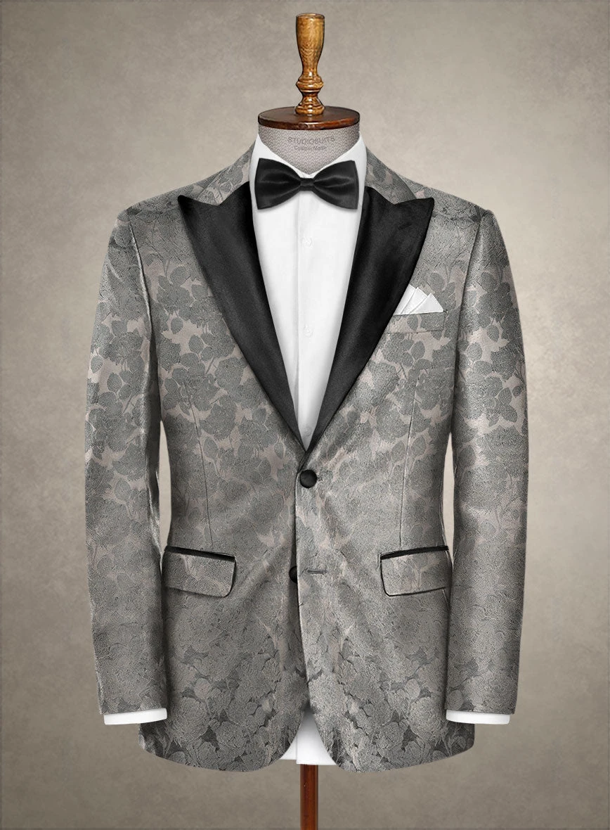 Admire subtlety with modest sophistication by pairing our Italian Silk Unaxi Tuxedo Suit. Firstly, constructed from a flourishing blend of silk, cotton, lycra, and jacquard fabric that grants a thick, bristly nature and a hint of shine to the material with a stamped leafy pattern over gray hues. And finally, bring your suave game to the next level by uniting a delicately tailored gray tuxedo suit that adds a layer of charm while capturing the honed silhouette with a cozy fit that perfectly harmonizes comfort and sharpness regardless of the occasion.