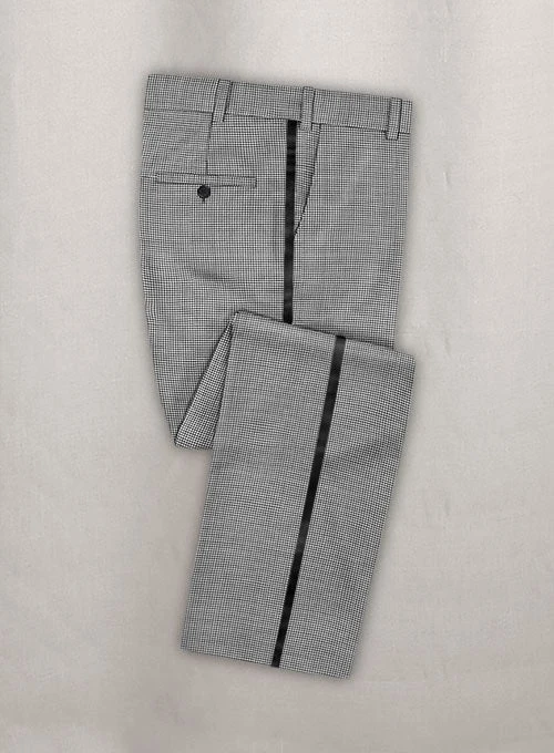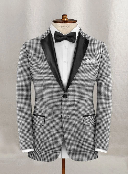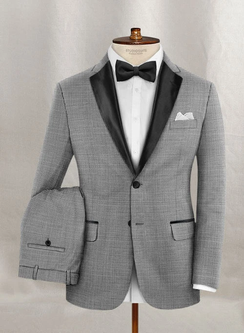 Setting a higher standard of living as never before by wearing our Napolean Mini Houndstooth White Wool Tuxedo Suit. The houndstooth suit is crafted from wool blend, providing a natural firmness and inventiveness, a unique look that gives you a feeling of completeness. Our white suit is an excellent choice for summer weddings and fancy events.