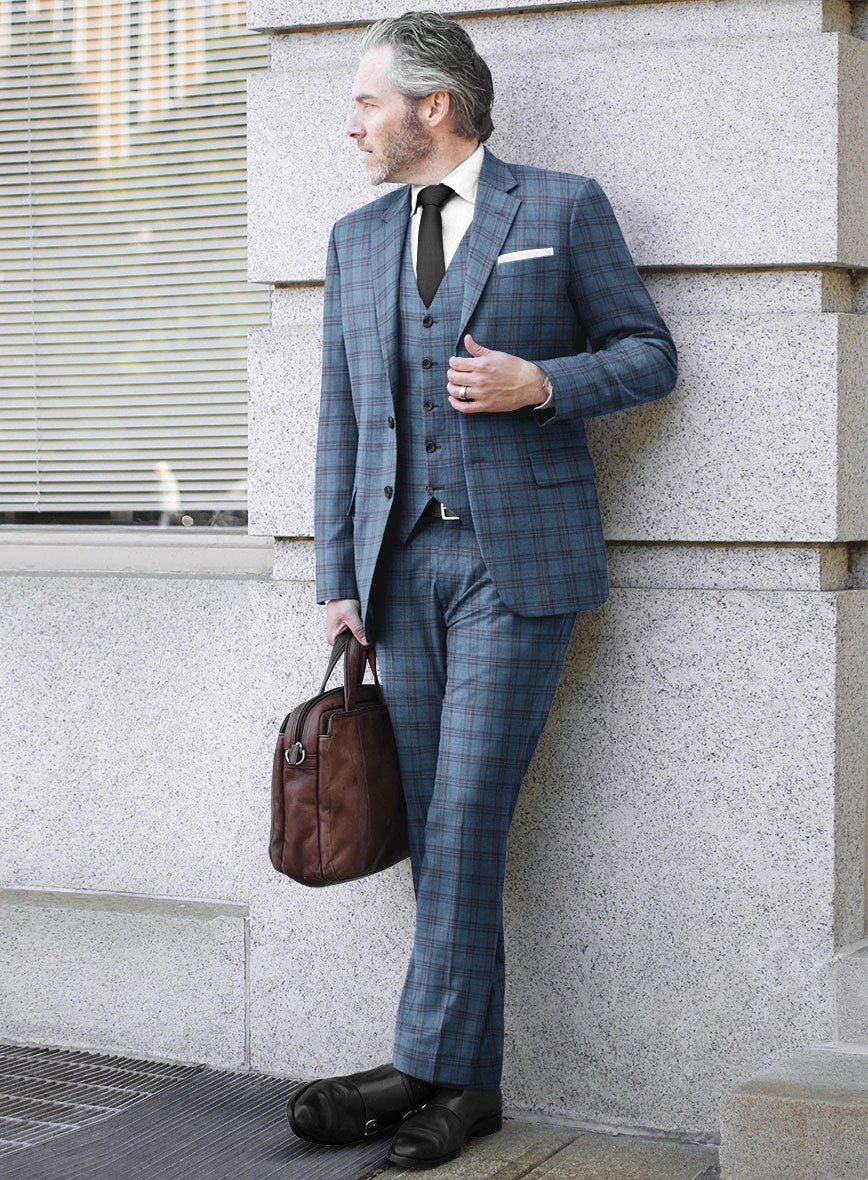 Add a hint of style to your look with our Reda Dusk Blue Checks Wool Suit. Crafted from pure wool, this suit boasts a sleek and effortlessly sophisticated design. The windowpane checkered pattern, created with brown threads on a dusk blue cloth, is perfect for amping up your fashion game to the next level. Wear this suit for any celebration or major event to showcase your refined and stylish appeal.