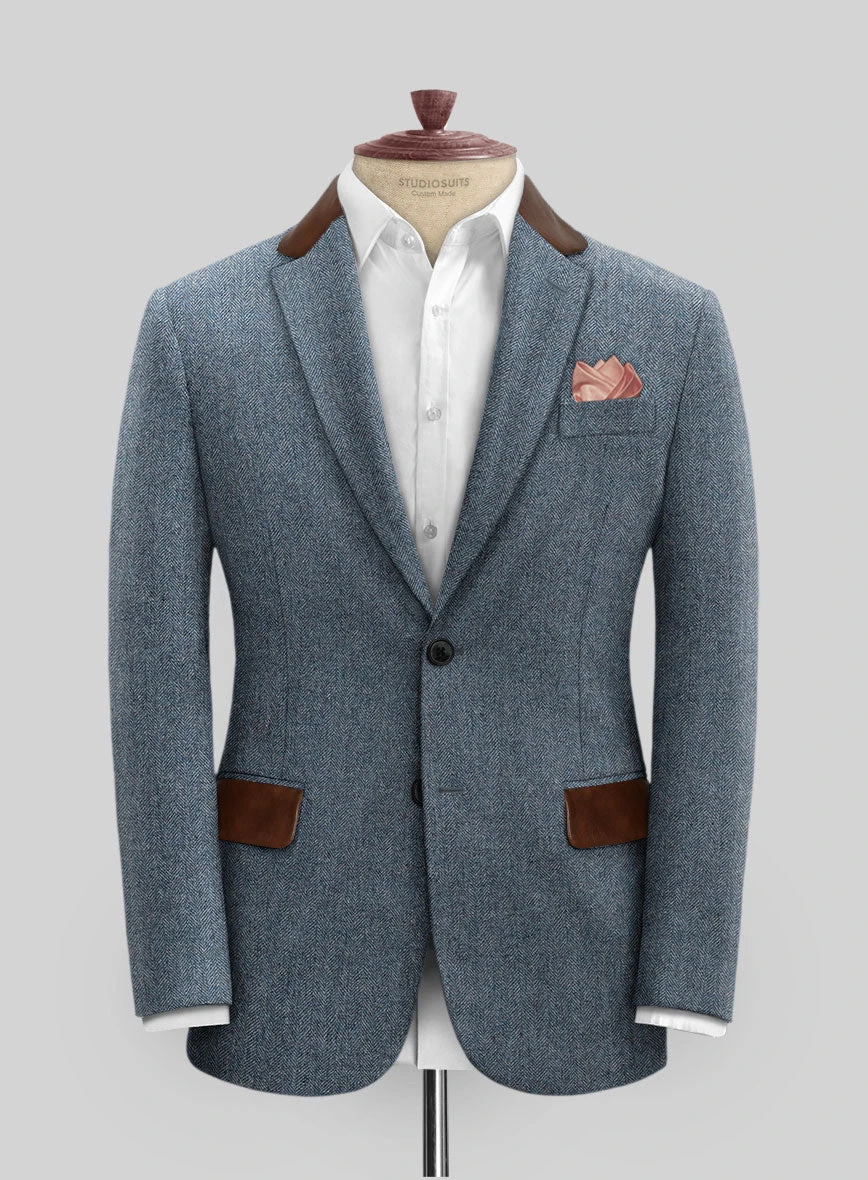 Vintage Herringbone Blue Tweed Suit with Leather trims on Jacket Collar & Flaps.