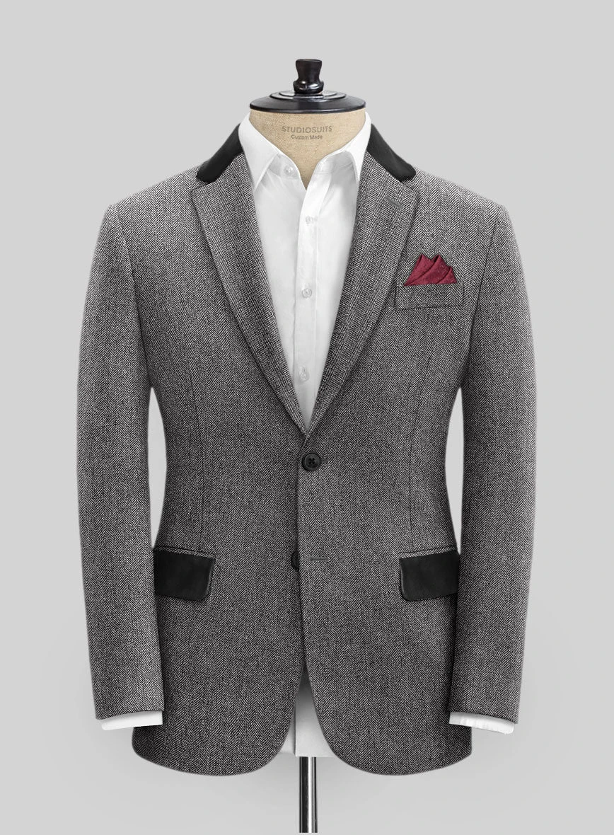 Vintage Herringbone Gray Tweed Suit with Leather trims on Jacket Collar & Flaps.